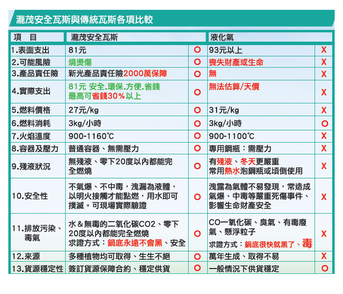 本產品燃燒熱效率高,不分冬天夏天均優於傳統瓦斯,在零下20度C以內均不結冰,寒冷條件下都可正常使用,不會像傳統瓦斯冬天熱效率低燃燒不完全易中毒及殘氣過多等問題。